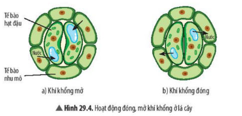 Câu hỏi Câu 6: Nguyên nhân chủ yếu làm cho khí khổng đóng hay mở là gì? Câu 7: Dựa vào kiến thức đã học về cấu tạo của khí khổng và quan sát Hình 29.4, em hãy cho biết thành tế bào hạt đậu có những biến đổi như thế nào trong hoạt động đóng, mở khí khổng.