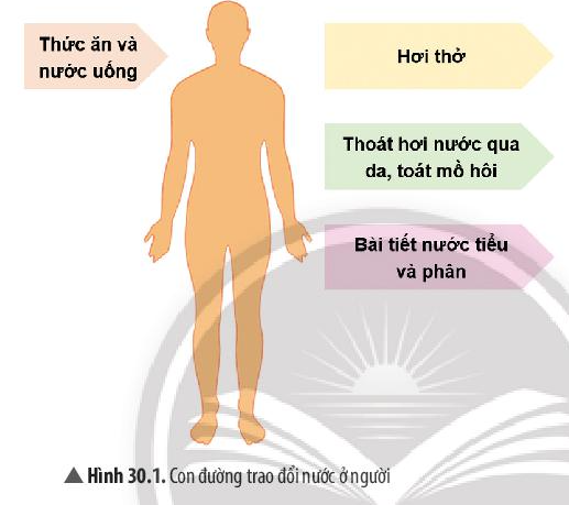 3. Quan sát Hình 30.1 và trả lời các câu hỏi sau: a) Nước được cung cấp cho cơ thể người từ những nguồn nào? b) Nước trong cơ thể người có thể bị mất đi qua những con đường nào? 4. Hãy trình bày con đường trao đổi nước ở động vật và người.