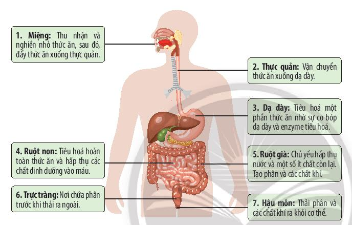 Thức ăn đi vào trong cơ thể người bằng miệng. Từ miệng, thức ăn được di chuyển đến các cơ quan khác nhau trong ống tiêu hoá, nhờ sự phối hợp giữa các cơ quan trong ống tiêu hoá và tuyến tiêu hoá (tuyến nước bọt, gan, túi mật và tụy) mà thức ăn được biến đổi thành các chất dinh dưỡng để cơ thể hấp thụ vào máu và cung cấp cho các cơ quan. Các chất thải được thải ra khỏi cơ thể qua hậu môn.
