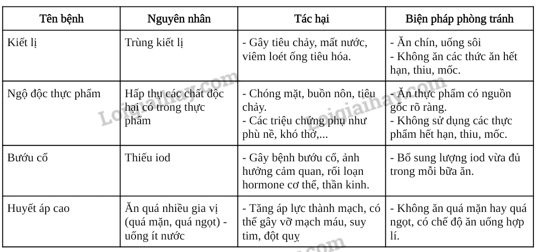 1. Tại sao nói “Các hệ cơ quan trong cơ thể động vật có mối quan hệ mật thiết với nhau?” Cho ví dụ chứng minh. 2. Nếu là một tuyên truyền viên, em sẽ tuyên truyền những nội dung gì về giáo dục vệ sinh ăn uống ở địa phương em? 3. Hãy tìm hiểu một số bệnh liên quan đến chế độ dinh dưỡng không hợp lí hoặc ăn uống không hợp vệ sinh ở địa phương em. Nêu biện pháp phòng tránh các bệnh đó theo mẫu trong bảng dưới đây.