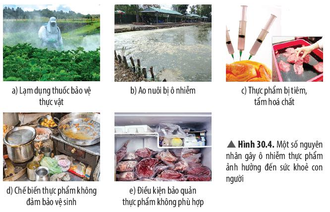 Hình 30.4. Một số nguyên nhân gây ô nhiễm thực phẩm ảnh hưởng đến sức khoẻ con người |