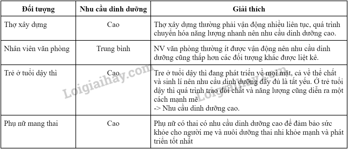 11. Hãy dự đoán nhu cầu dinh dưỡng của các đối tượng sau đây cao hay thấp. Giải thích. a) Thợ xây dựng. b) Nhân viên văn phòng. c) Trẻ ở tuổi dậy thì. d) Phụ nữ mang thai. 12. Cho ví dụ về những tác hại của việc thừa hoặc thiếu các chất dinh dưỡng. |