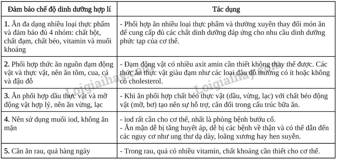 Vận dụng những hiểu biết về trao đổi chất và chuyển hoá năng lượng người, em hãy đề xuất một số biện pháp trong việc đảm bảo chế độ dinh dưỡng hợp lí và vệ sinh ăn uống để bảo vệ sức khoẻ con người. Cho biết tác dụng của các biện pháp đó. |