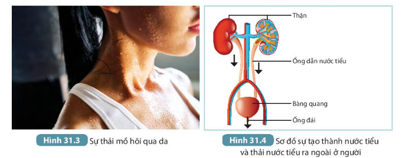 Hoạt động Đọc thông tin trên và thảo luận để trả lời các câu hỏi sau: Câu 1: Em có thể bổ sung nước cho cơ thể bằng những cách nào? Câu 2: Quan sát Hình 31.3 và 31.4, cho biết nước đào thải ra khỏi cơ thể như thế nào?