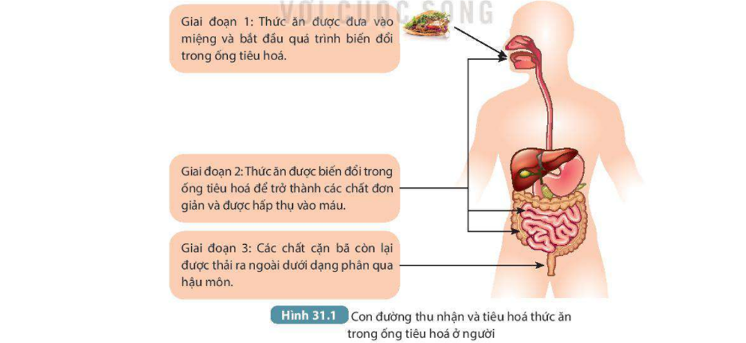 Câu hỏi Quan sát Hình 31.1, hãy mô tả con đường thu nhận và tiêu hóa thức ăn trong ống tiêu hóa ở con người.