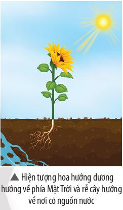 Trong hình bên, rễ của của cây hướng dương hướng về nguồn nước, còn hoa của nó luôn hướng về phía Mặt Trời. Hãy giải thích hiện tượng đó.