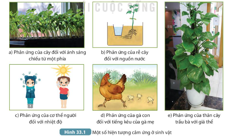 Ví dụ nếu cây ở hình 33.1a không sinh trưởng hướng về phía ánh sáng thì lá cây sẽ ngả vàng, thân còi cọc, nhìn thiếu sức sống do không tổng hợp được chất hữu cơ nuôi cơ thể. Vì vậy, việc cây vươn về phía ánh sáng là một hiện tượng cảm ứng hướng sáng giúp cây sinh tồn và phát triển. Tóm lại, đối với sinh vật cảm ứng giúp sinh vật thích ứng với những thay đổi của môi trường để tồn tại và phát triển.
