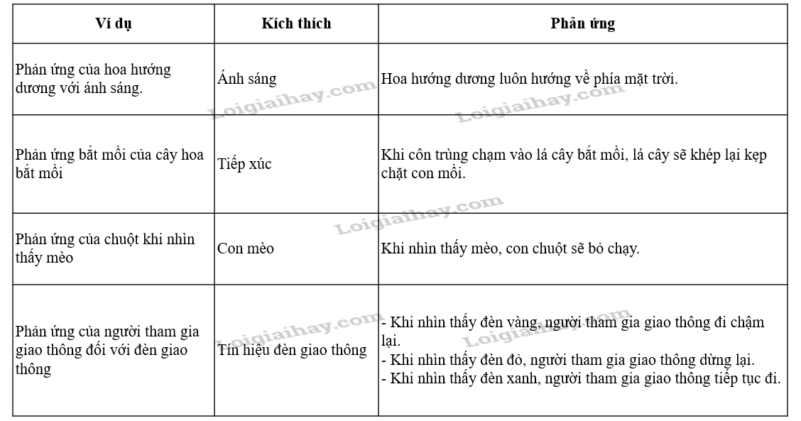 | Nêu thêm một số ví dụ về hiện tượng cảm ứng ở thực vật và động vật. Chỉ rõ tác nhân kích thích và phản ứng của sinh vật. |