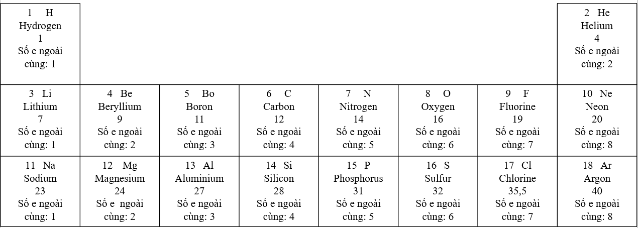 + Hàng thứ 3: Số electron ở lớp ngoài cùng tăng dần từ 1 đến 8