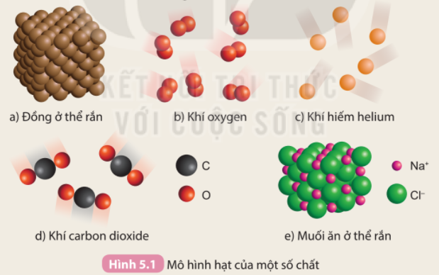 Mô hình hạt của đồng ở thể rắn, khí oxygen, khí hiếm helium, khí carbon dioxide và muối ăn ở thể rắn được biểu diễn trong Hình 5.1
