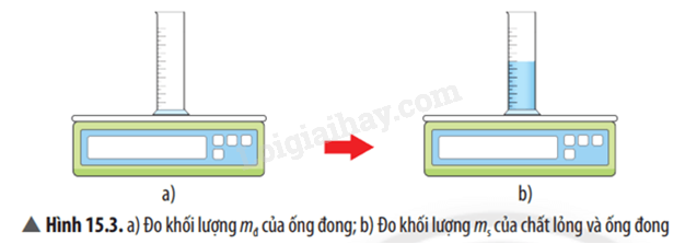 Bước 1: Đặt ống đong lên bàn cân. Đo giá trị khối lượng ban đầu của ống đong là mđ (Hình 15.3a).