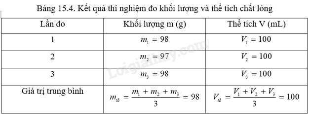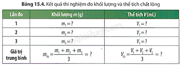 Bước 4: Thực hiện đo ba lần với cùng một lượng chất lỏng. Ghi kết quả theo mẫu Bảng 15.4. Tính giá trị trung bình của các phép đo.