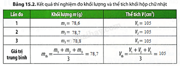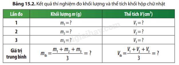 Giả sử, ta thực hiện thí nghiệm với khối hộp chữ nhật bằng gỗ. Làm theo các bước ta thu được bảng 15.2 như sau: