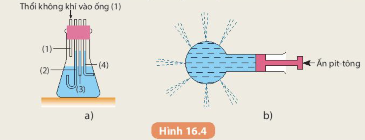 1. Hình 16.4a: khi thổi không khí vào ống (1) ở thì thấy hiện tượng là các cột nước trong ống (2), (3) và (4) sẽ dâng lên với độ cao xấp xỉ bằng nhau.