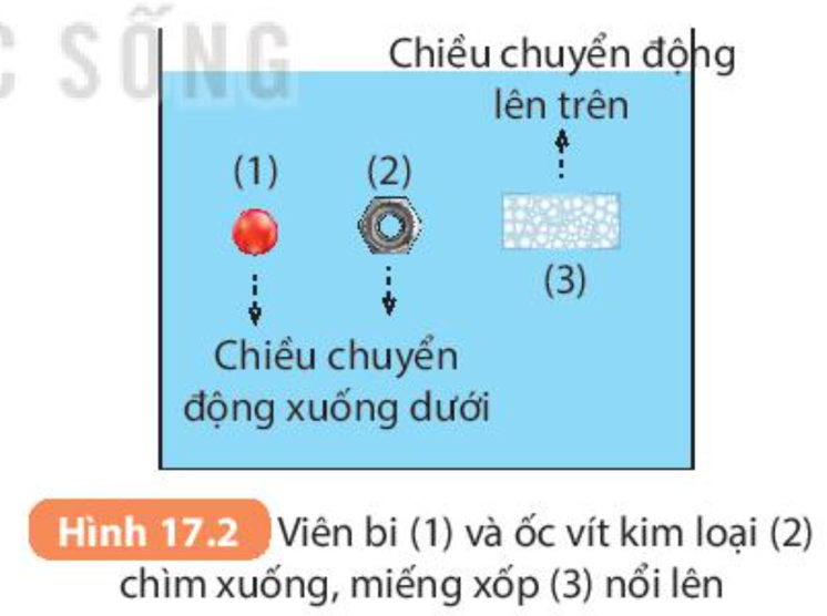 1. Có 2 lực tác dụng vào viên bi, ốc vít kim loại và miếng xốp: Trọng lực của vật thẳng đứng hướng xuống và lực đẩy Archimedes thẳng đứng hướng lên.
