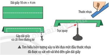 Dùng kéo cắt một dải giấy thành hình dạng như hình bên, rồi đặt nó cân bằng trên một trục quay. Quan sát và mô tả hiện tượng xảy ra khi đưa một đầu thước nhựa đã được cọ xát với vải khô đến gần dải giấy.