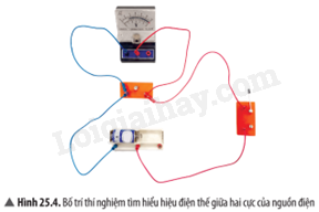 Bước 1: Lắp các bộ phận tạo thành mạch điện như Hình 25.4. Ban đầu công tắc mở (mạch hở). Kiểm tra hoặc điều chỉnh để kim vôn kế chỉ đúng vạch số 0.