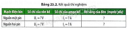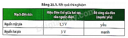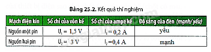 Bước 2: Đóng công tắc (mạch kín). Quan sát độ sáng của bóng đèn và ghi kết quả thí nghiệm theo mẫu Bảng 25.1.