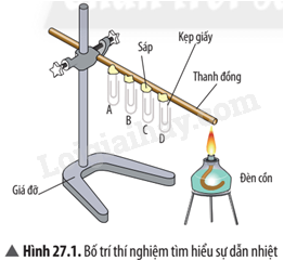 Bước 2: Dùng đèn cồn hơ nóng một đầu thanh đồng (Hình 27.1). Quan sát hiện tượng xảy ra với các kẹp giấy.