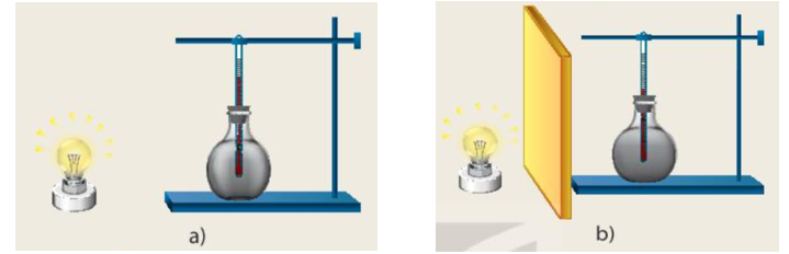 Hình 28.5b thì nhiệt độ trong bình thuỷ tinh lại giảm dần về nhiệt độ cũ vì ở giữa đèn và bình thuỷ tinh bị ngăn cách 1 tấm gỗ dày --> nhiệt không được truyền đến bình thuỷ tinh