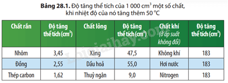 Từ Bảng 28.1, hãy so sánh sự nở vì nhiệt của chất rắn, chất lỏng và chất khí.