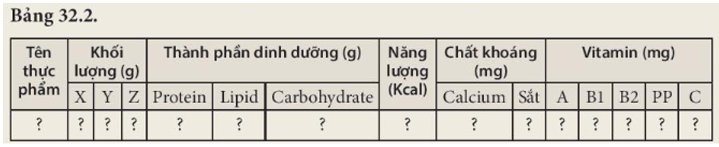 2. Thực hành xây dựng khẩu phần ăn cho bản thân theo các bước sau: Bước 1: Kẻ bảng ghi nội dung cần xác định theo mẫu Bảng 32.2
