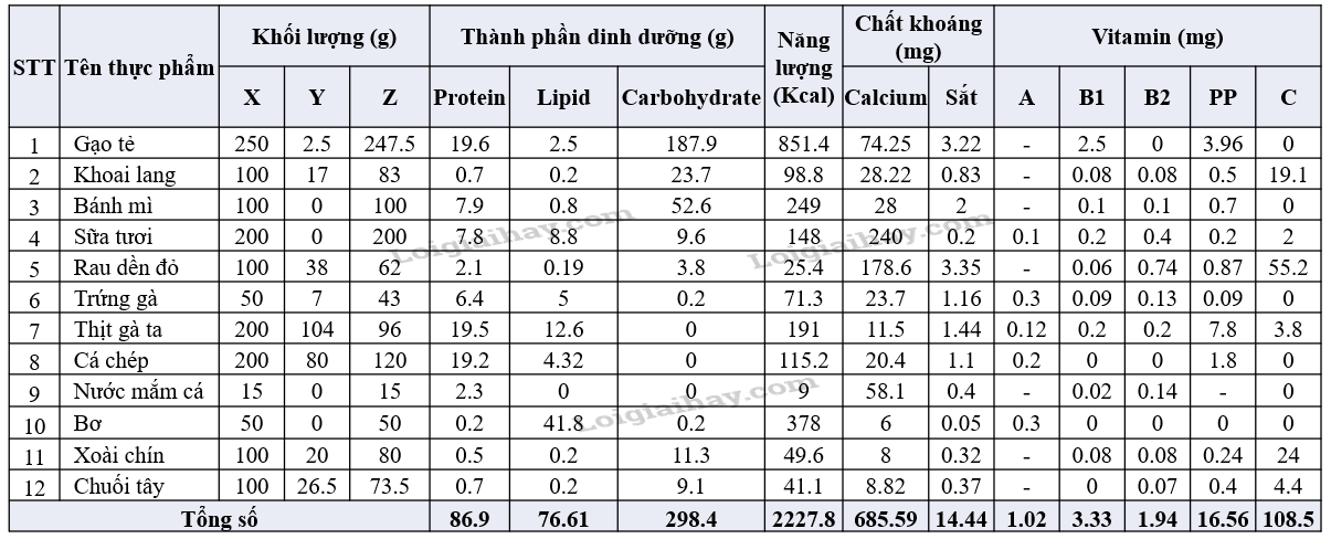 Bước 2: Điền tên thực phẩm và xác định lượng thực phẩm ăn được. Xác định tên thực phẩm và lượng thực phẩm ăn được (Z), Z = X - Y. Trong đó X là khối lượng cung cấp, Y là lượng thải bỏ, Y = X x tỉ lệ thải bỏ. Lưu ý: xác định tỉ lệ thải bỏ của thực phẩm bằng cách tra Bảng 32.3. Bước 3. Xác định giá trị dinh dưỡng của các loại thực phẩm. Xác định giá trị dinh dưỡng của từng loại thực phẩm bằng các lấy số liệu ở Bảng 32.3 nhân với khối lượng thực phẩm ăn được (Z) chia cho 100. Bước 4: Đánh giá chất lượng của khẩu phần. Cộng các số liệu đã liệt kê, đối chiếu với Bảng 32.1, từ đó điều chỉnh chế độ ăn uống cho thích hợp. Bước 5: Báo cáo kết quả sau khi đã điều chỉnh khẩu phần ăn. |