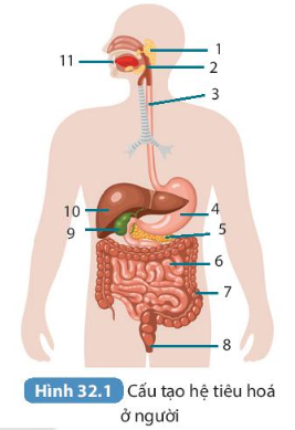 1. Nêu tên các cơ quan của hệ tiêu hóa tương ứng với những vị trí được đánh số trong hình. 2. Xác định tên ba cơ quan mà thức ăn không đi qua. |