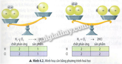Quan sát Hình 4.2, hãy cho biết phương trình nào đã được cân bằng. Vì sao?