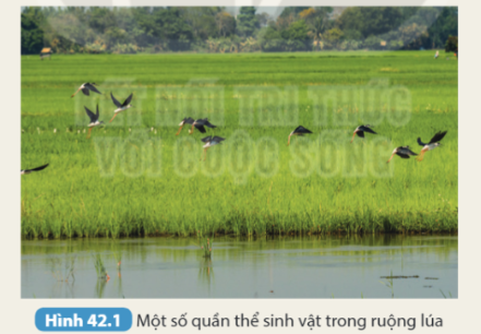 1. Quan sát hình 42.1, cho biết trong ruộng lúa này có thể có những quần thể sinh vật nào? 2. Lấy một ví dụ về quần thể sinh vật trong tự nhiên và một quần thể vật nuôi hoặc cây trồng. |