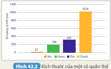 Hình 42.2 biểu thị kích thước của 4 quần thể cùng sống trong một khu rừng. Em hãy quan sát hình, so sánh và rút ra nhận xét về tương quan giữa kích thước cơ thể và kích thước quần thể voi, hươu, thỏ, chuột. |