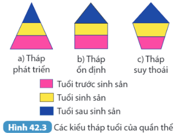 | Quan sát hình 42.3, hãy nhận xét mối tương quan về số lượng cá thể của nhóm tuổi trước sinh sản và nhóm tuổi sinh sản trong mỗi kiểu tháp tuổi. |