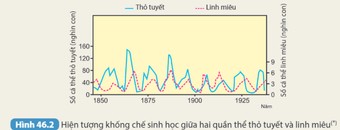 | Quan sát hình 46.2, hãy cho biết số lượng cá thể thỏ tuyết và linh miêu khống chế lẫn nhau như thế nào? |