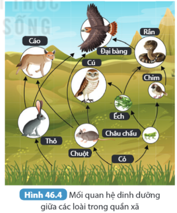 | Quan sát hình 46.4, phân tích một số mối quan hệ về dinh dưỡng giữa các loài và cho biết loài sinh vật nào có ảnh hưởng lớn nhất đến sự tồn tại của các loài khác trong quần xã. Tại sao? |