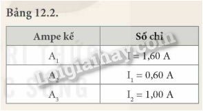 - Đóng công tắc, đọc giá trị cường độ dòng điện chạy trong mạch chính (số chỉ của ampe kế A1) và cường độ dòng điện chạy trong các mạch nhánh (số chỉ của các ampe kế A2 và A3), ghi vào vở theo mẫu tương tự Bảng 12.2