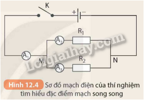 - Mắc hai điện trở và ba ampe kế vào mạch điện theo sơ đồ Hình 12.4
