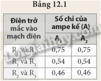 - Lặp lại thí nghiệm với các cặp điện trở R1, R3 và R2, R3, ghi số chỉ của ampe kế vào vở theo mẫu tương tự Bảng 12.1.