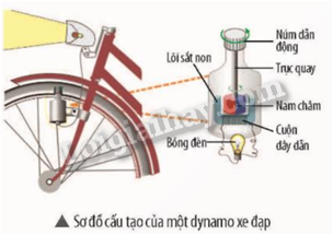 Sơ đồ bên mô tả cấu tạo của một dynamo xe đạp. Khi núm dẫn động của dynamo quay quanh trục, nam châm quay theo và tạo ra dòng điện cảm ứng làm đèn sáng.