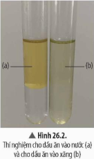 Quan sát Hình 26.2, hãy so sánh khả năng tan trong nước và trong xăng của dầu ăn.