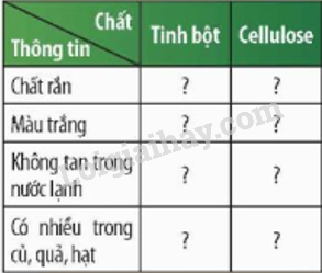 Chọn thông tin đúng cho tinh bột hay cellulose, điền dấu (x) để hoàn thành bảng theo mẫu sau: