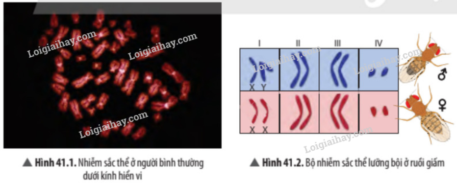 Quan sát Hình 41.1 và 41.2, hãy nhận xét về hình dạng và số lượng nhiễm sắc thể ở các loài sinh vật