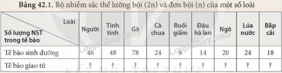 1. Xác định số lượng NST trong giao tử của mỗi loài bằng cách hoàn thành vào vở theo mẫu bảng 42.1.