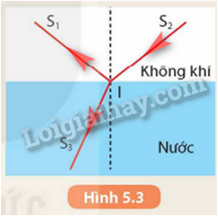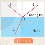 Một tia sáng truyền tới mặt nước tạo ra một tia phản xạ và một tia khúc xạ. Người vẽ đã quên và ghi lại chiều truyền của các tia sáng này trong Hình 5.3. Hãy vẽ vào vở và bổ sung chiều mũi tên của các tia sáng trong hình.