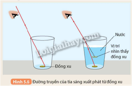 Ta nhìn thấy được đồng xu khi đổ nước vào vì lúc này đường truyền của tia sáng đã bị lệch hướng khiến chúng ta có thể nhìn thấy