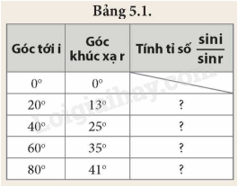 - Đọc giá trị của góc khúc xạ tương ứng và hoàn thành vào vở theo mẫu tương tự bảng 5.1.