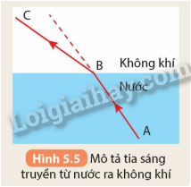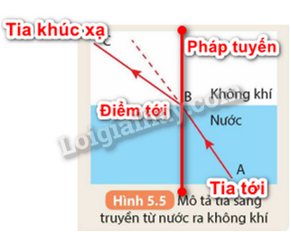 Hình 5.5 mô tả hiện tượng khúc xạ khi tia sáng truyền từ môi trường nước ra không khí. Chỉ ra điểm tới, tia tới, tia khúc xạ, vẽ pháp tuyến tại điểm tới. So sánh độ lớn của góc khúc xạ và góc tới