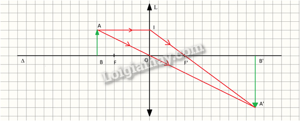 - Vẽ ảnh thật A’B’ có độ cao 6 ô đặt trước thấu kính, vuông góc với trục chính, có điểm B’ nằm trên trục chính và cách thấu kính 12 ô.