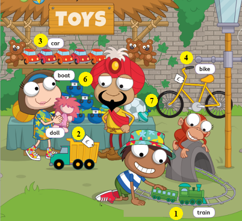Rose: It’s (5) a kite! And look! (6) A ball and (7) a boat.