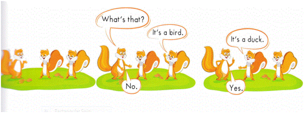 Cách chơi: Một bạn sẽ dùng hành đông để diễn tả 1 con vật và hỏi đó là con gì “What’s that?”. Một bạn khác sẽ đoán đó là con gì, ví dụ “It’s a bird. (Nó là con chim.), hay “It’s a duck” (Nó là con vịt.) . Nếu đúng thì nói “Yes”, sai nói “No”.