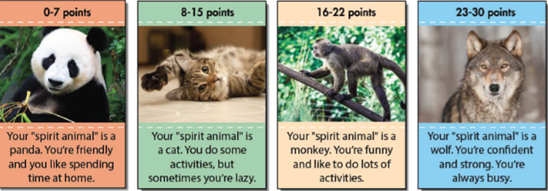 a. You’re doing a quiz about your free time activities to find out your “spirit animal”. Work in pairs. Add three more activities and then ask your friend to complete the quiz.